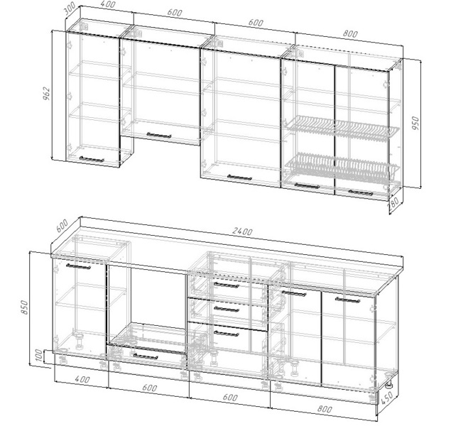 • Фасады со свесом – дают возможность использовать верхние модули без установки ручек, а также установить скрытую подсветку